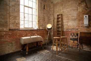 565 sq ft split level industrial studio location with high ceilings, brick walls, providing atmospheric daylight throughout the whole day coming through industrial bay windows and skylights.
